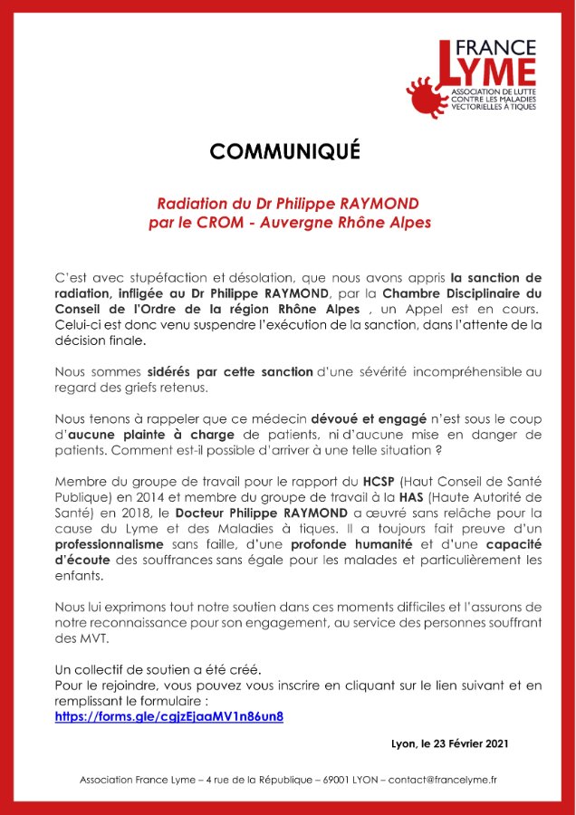Re: Radiation d’un médecin très impliqué dans la cause du Lyme et MVT