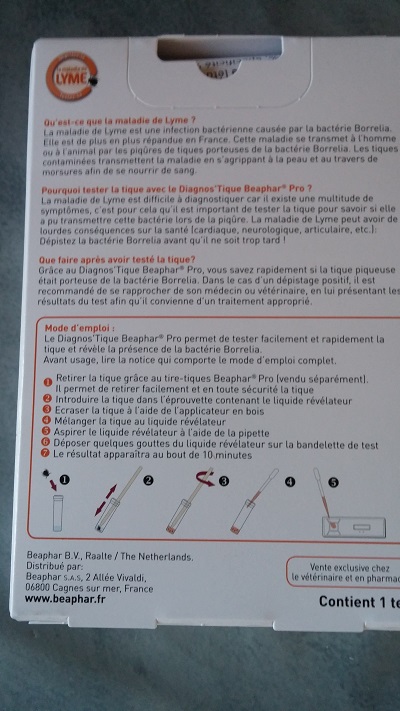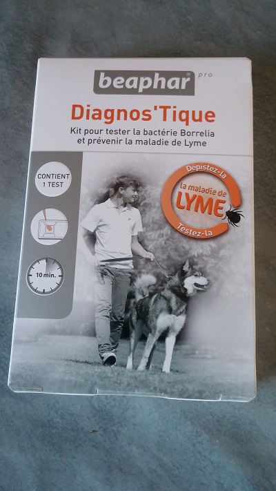 A ma grande surprise, en allant à la pharmacie, j'ai trouvé ce test qui a le doux nom de "DIAGNOS'TIQUE" de chez BEAPHAR.
