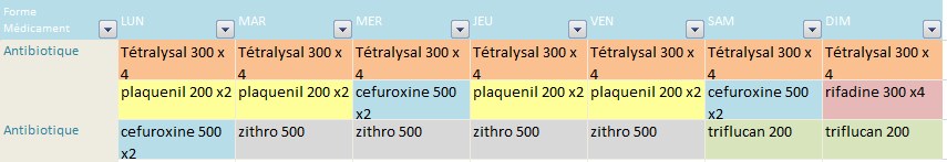 bonjour, eh bien je connais cette liste ; j'en suis à mon troisième traitement (1 light, 1 lourd et le nouveau une petite adaptation du lourd) ; pour info, je note tous les jours dans un carnet où j'en suis des médocs qui sont à prendre par plages (par ex Texodil, 2/10 ; Arrêt Ciflox 4/20) ; aucun risque d'erreur avec ça (plus le pilulier de compétition). J'ai commencé le tout premier traitement en octobre et j'en suis à J+7 de l'actuel. Je pensais que les premiers jours après l'arrêt dû aux analyses seraient sportifs et que ça se tasserait, mais non, on continue joyeusement avec les nausées et autres trucs sympas.