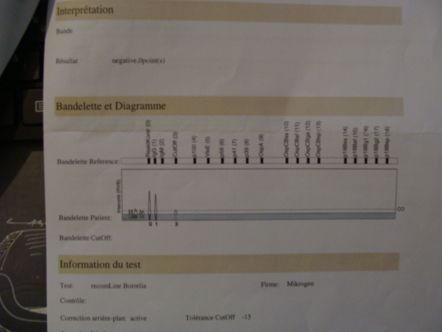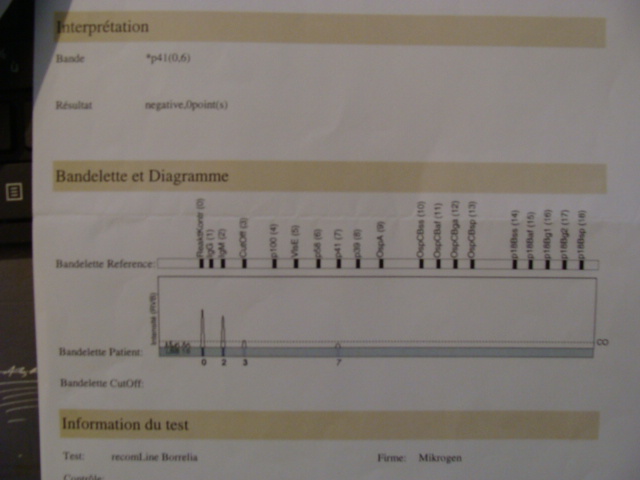 Bonjour Annie. Merci pour ta réponse. C'est gentil. Que signifie sensibilité neuroborréliose 91 %? Donc d'après les bandes, je suis contaminé par soit B.burgdorferi ou B.afzellii ou B.garinii ou B.spielmanii? Une de ces 4 souches de borrélies??? Y'a un truc qui me chiffonne, le Dr Vayssier-Taussat d...