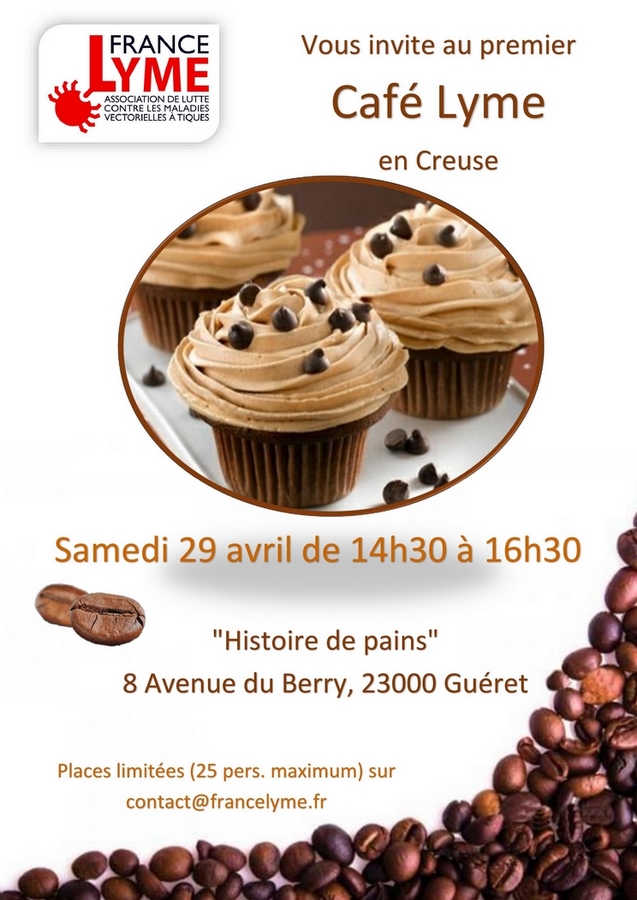 Le premier café-rencontre pour les malades de Lyme et leurs proches en Creuse aura lieu le samedi 29 avril 2017 à Guéret, de 14h30 à 16h30 à "Histoire de Pains".