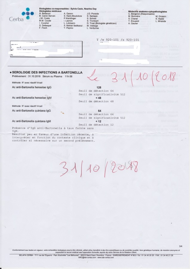 Cerba m'a trouvé une babésiose mais n'a testé que les henselae, il faut que je teste la quintana dont les symptômes me semblent évocateurs.