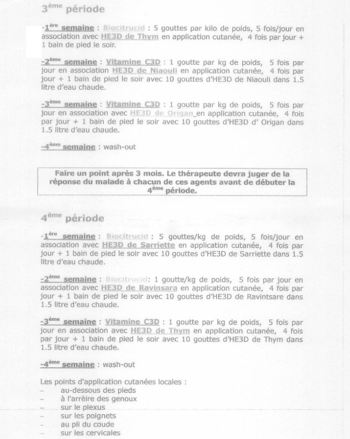 Mon homeopathe m'a prescrit un protocole sur 4 mois avec des HE 3 D (Diluées, Dynamisées, Dispersées) de chez phytofrance. Ce protocole a été mis au point par une naturopathe et un médecin de la Drôme.